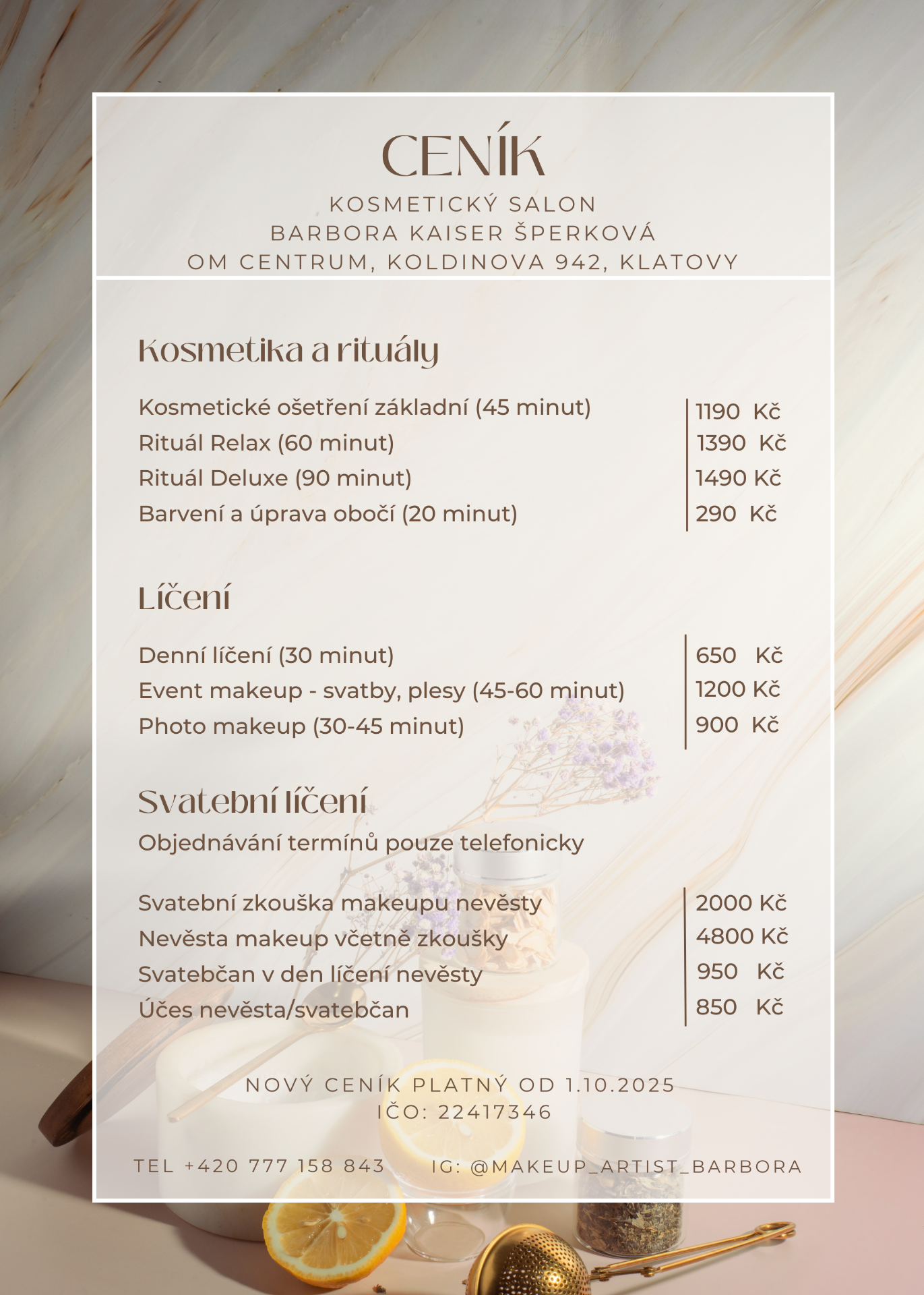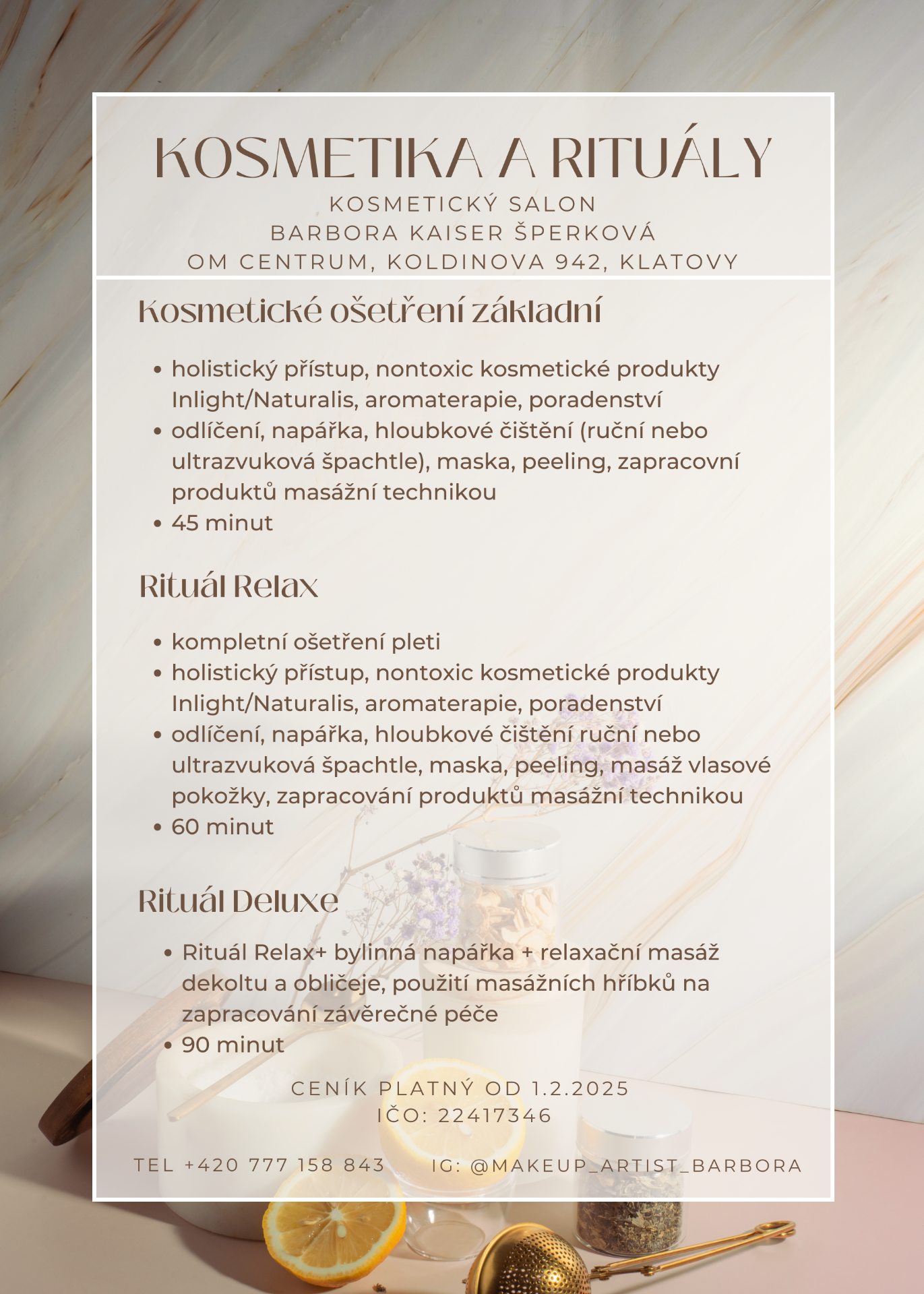 přijďte se zrelaxovat a načerpat energii. Začínala jsem jako vizážistka a v únoru 2025 jsem pro Vás rozšířila služby o kosmetiku. Postupem času jsem zjistila, že přírodní kosmetika bude jasnou volbou jak pro mě, tak pro mé klienty. Pracuji se 100% přírodními produkty značky Inlight, Naturalis, Phyt's. Najdete u mě jak klasické kosmetické ošetření, tak i rituály. Vše s respektujícím přístupem a možností volby postupu ošetření.